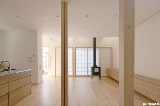 美しい自然乾燥の米松無垢はせん断に大変強い材です。大きなスパンも飛ばせて開放的です。こちらは集成材ではございません。(木造3階の場合など構造計算上、集成材を使用することがあります。)