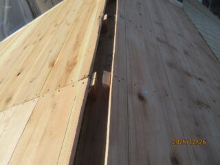 屋根下地は杉無垢で調湿もします。この屋根下地をこの20年くらい前からは多くのの木造建築では、構造用合板に様変わり。合板は湿気や暑さに弱いのに、なぜか、杉無垢が使われなくなっております。