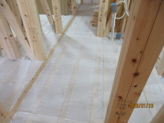 写真はセルローズファイバーの断熱作業中で、こちらも一見の価値あり。(柱は四方スリット)