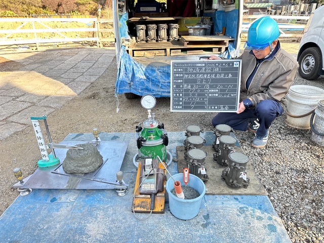 一級建築士である落合監督、立ち合いのもと、コンクリートスランプ、空気量、塩化物量、フロー値、確認。
