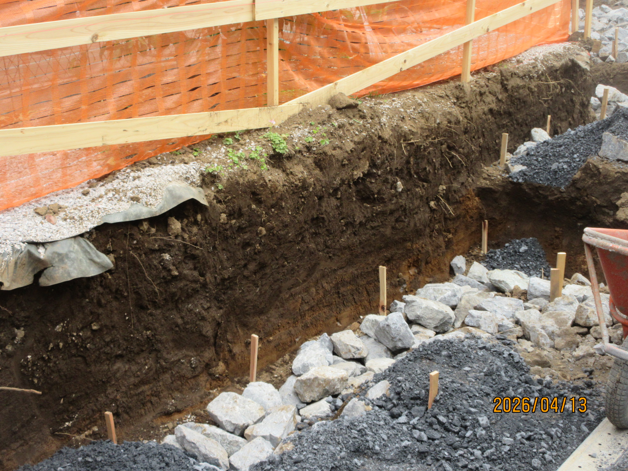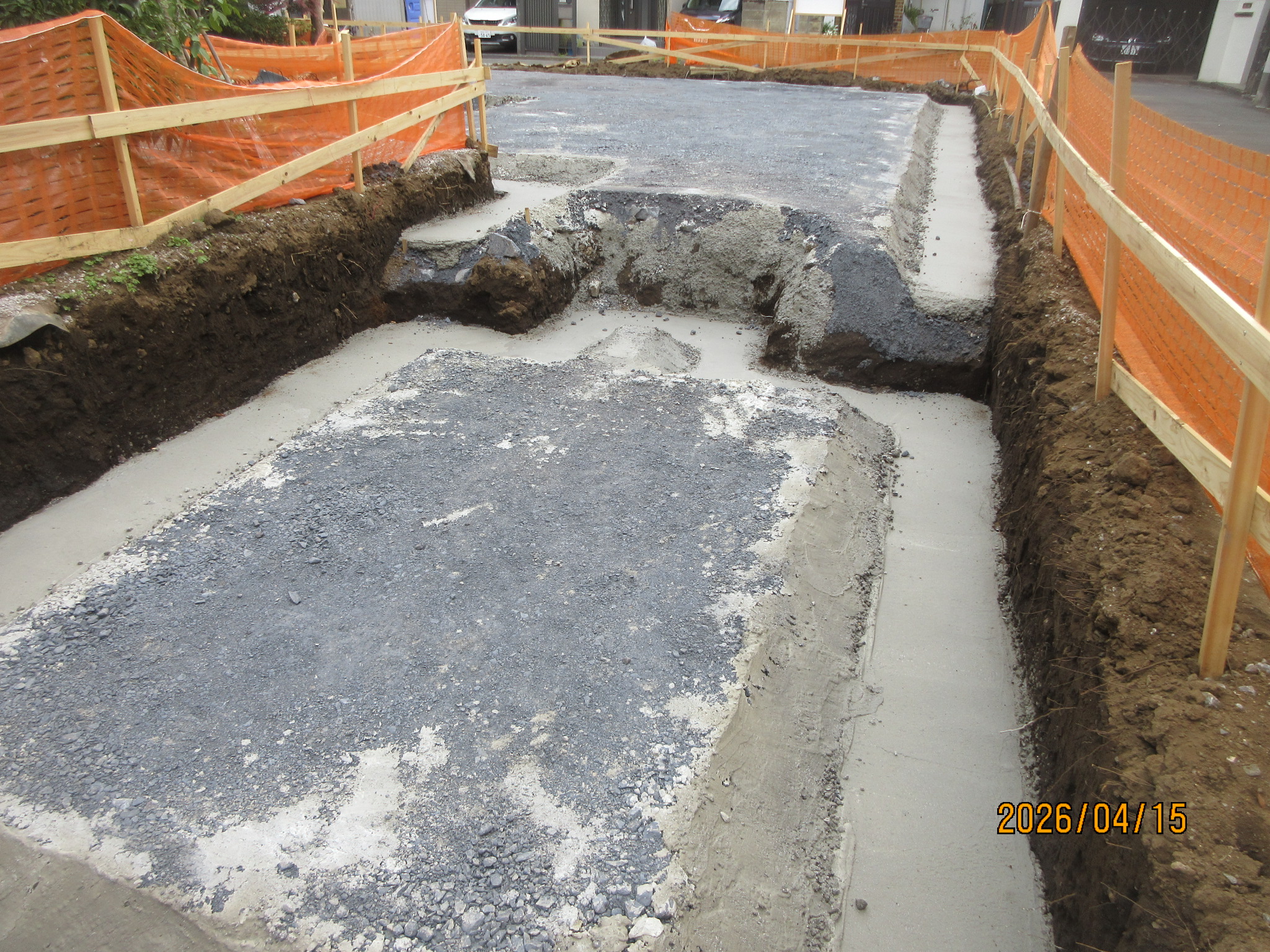 世田谷区代田で基礎工事の見学が可能です。安定した地盤だったので、杭や改良工事が不要だった為、割栗石を+40-0砕石をランマで十分な転圧を行います。