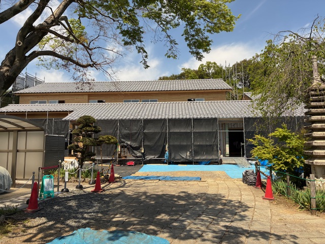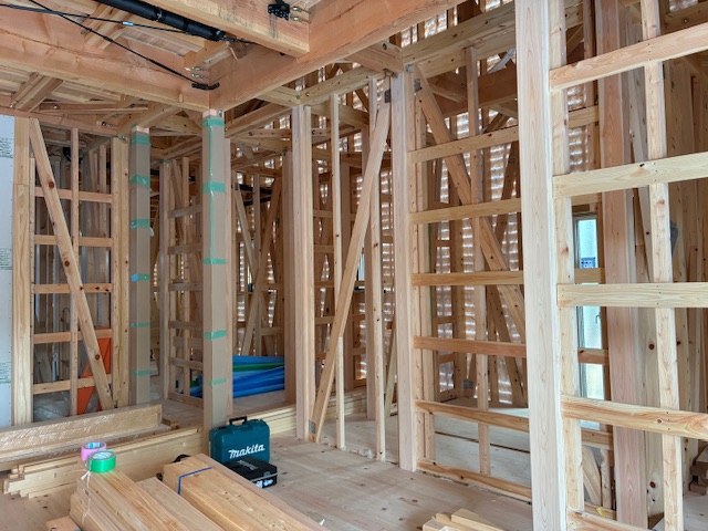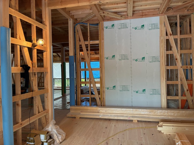 練馬区 庫裡、客殿の木工事が順調に進んでおります。筋交い、間柱、根太、大引き、貫もすべて桧無垢、真壁には耐力壁としてモイスを採用。
