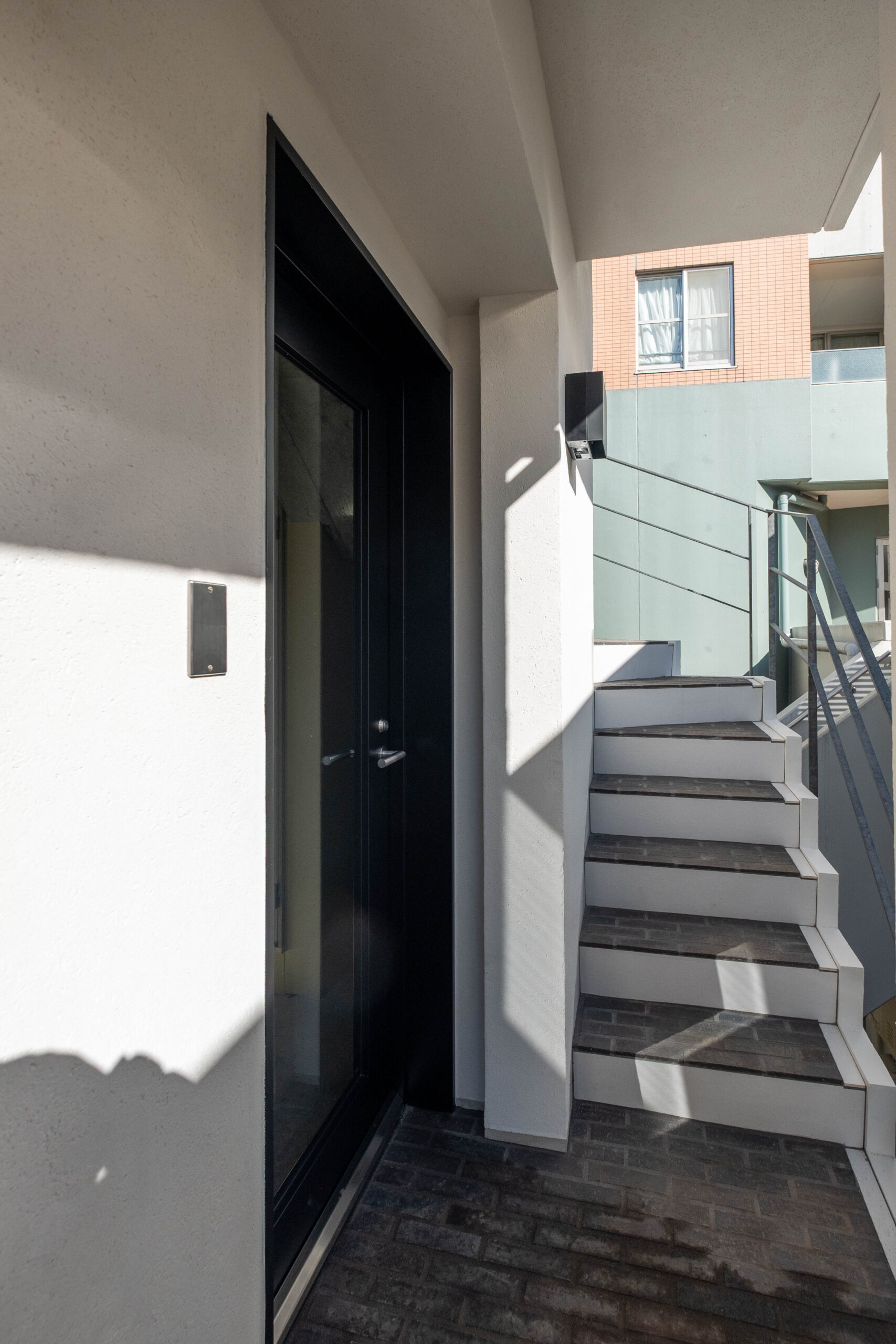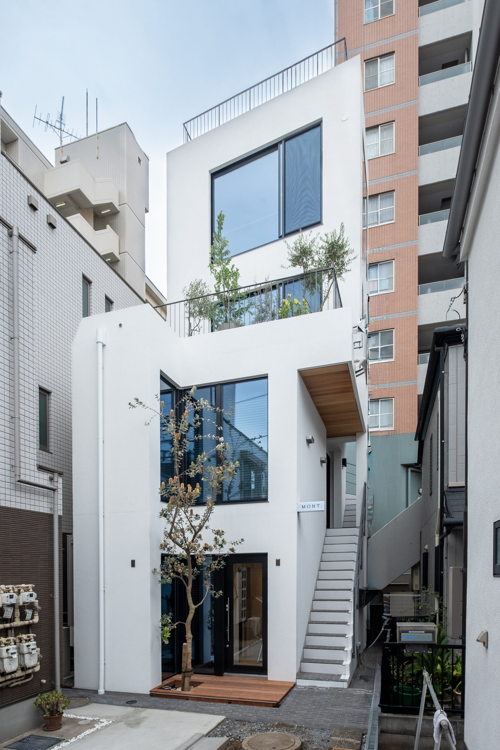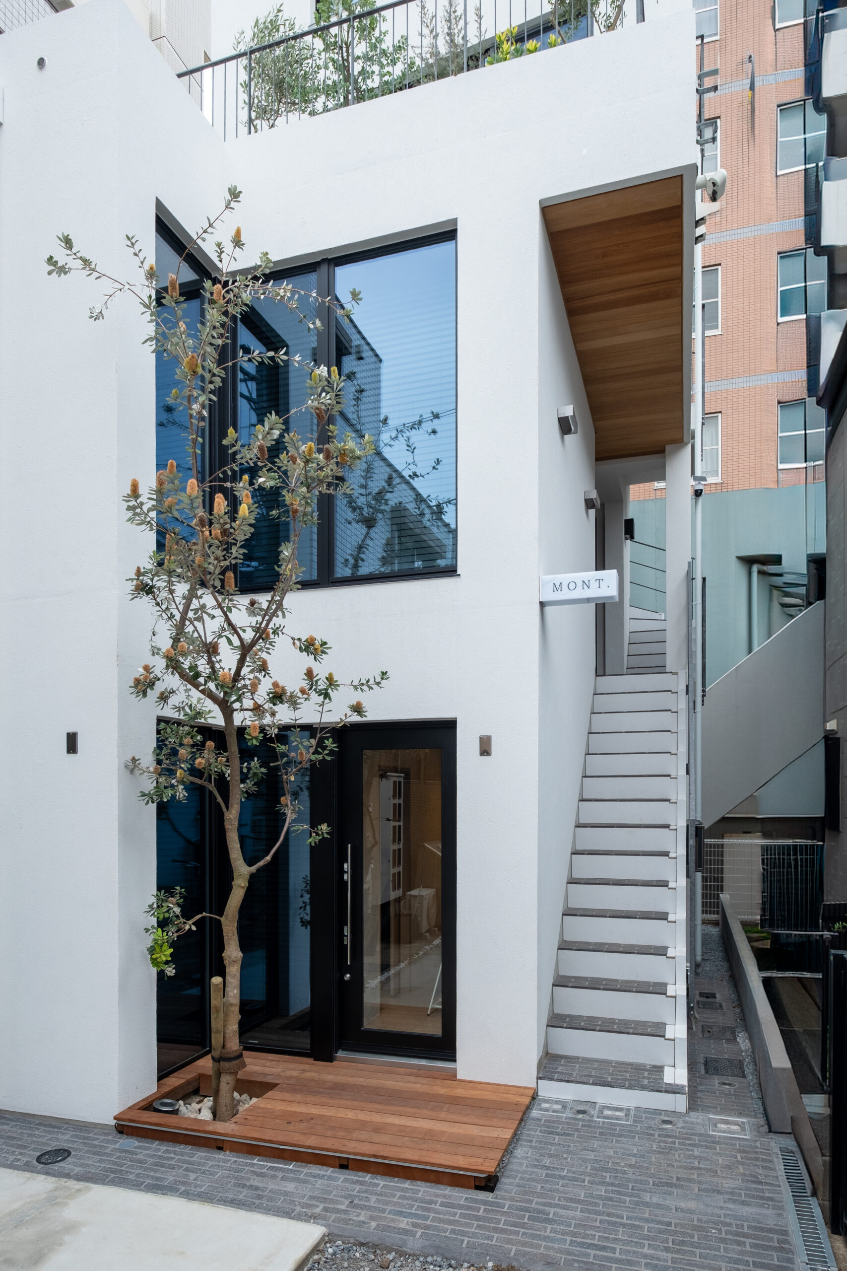 中目黒駅から徒歩3分の好立地に壁式鉄筋コンクリートの4階建+屋上(テナントビル)MONT. 軒裏チーク無垢/階段床は国代耐火工業の煉瓦/リン酸処理のバルコニー手摺/窓枠は桧無垢