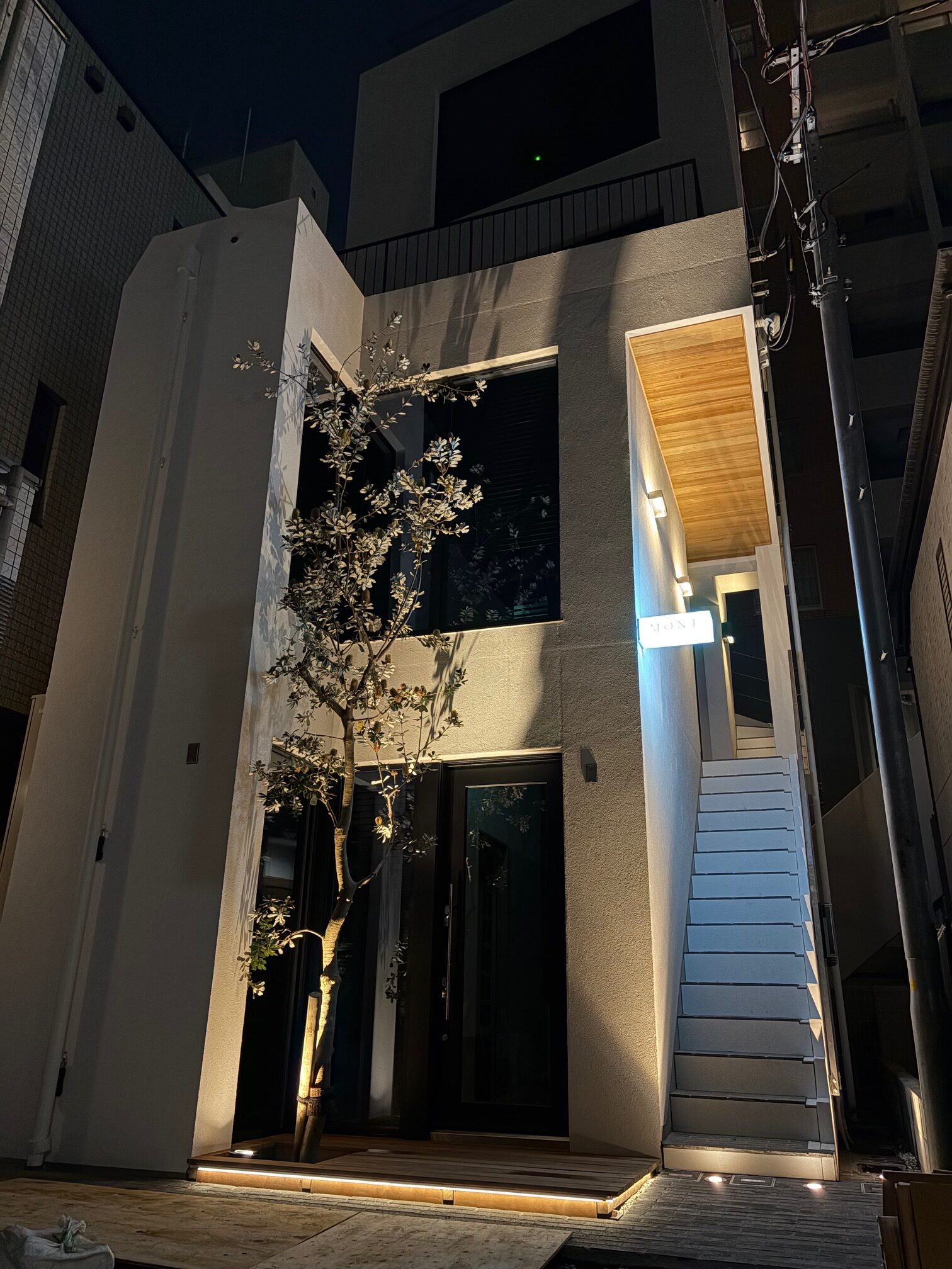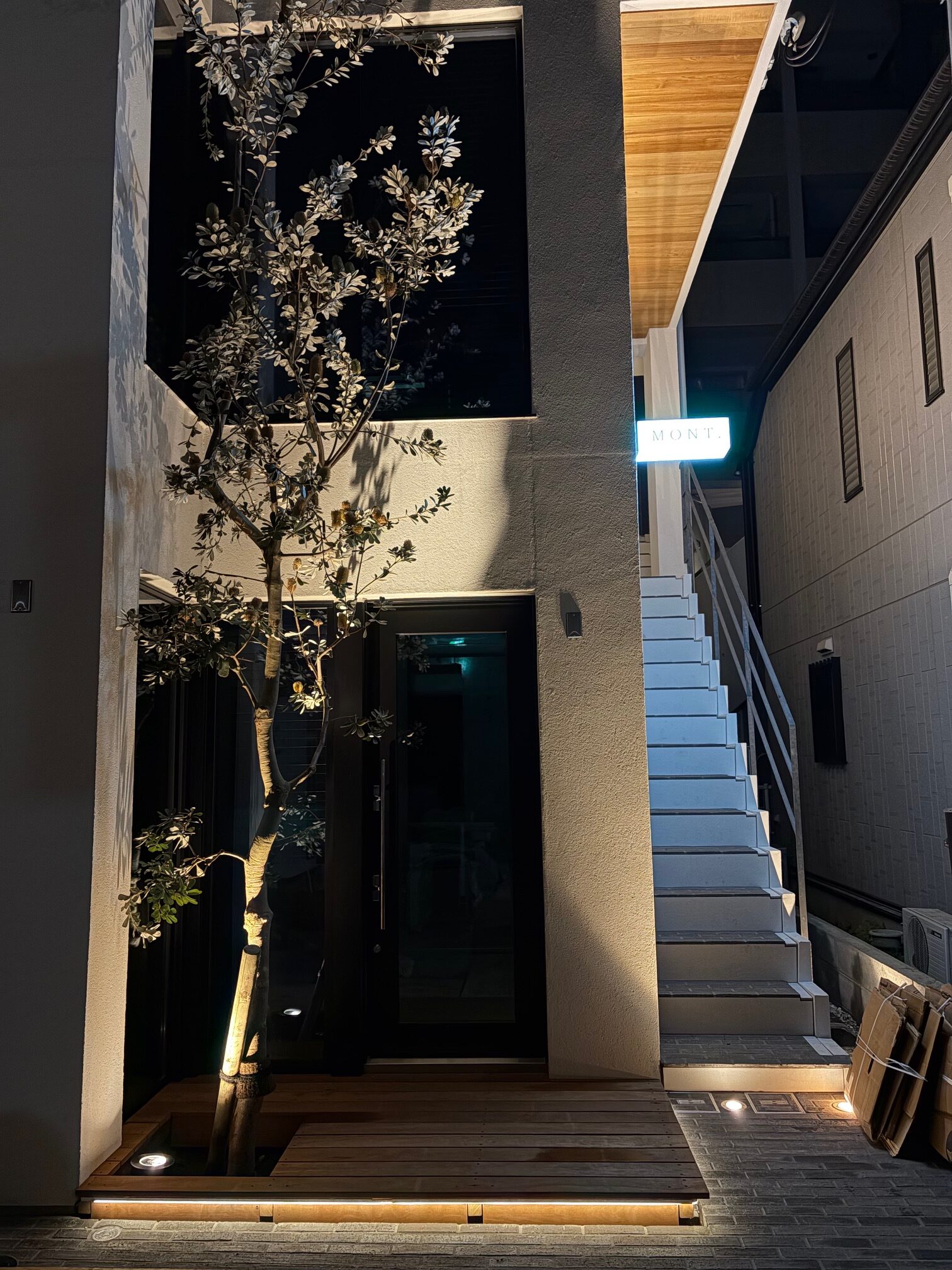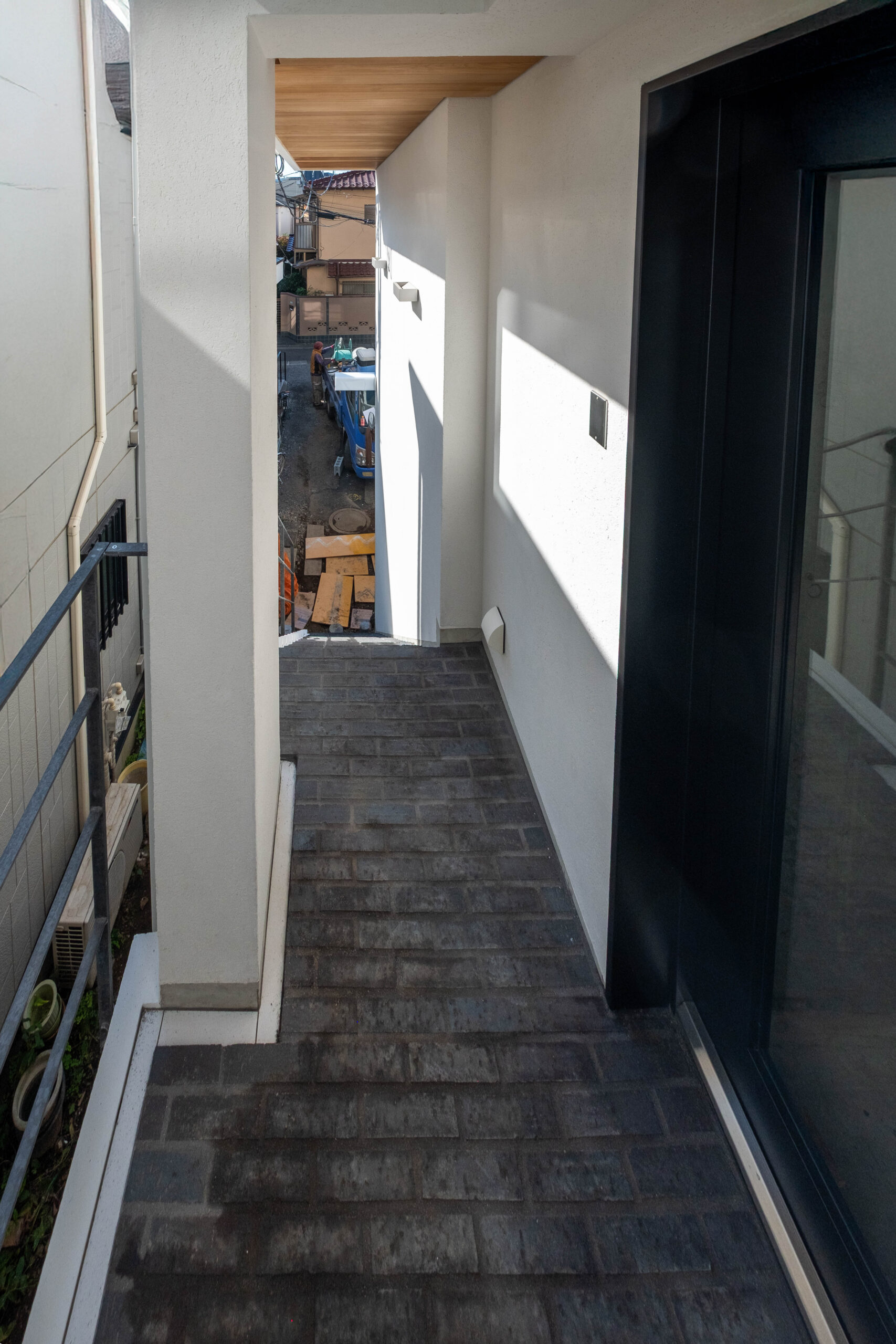 中目黒駅から徒歩3分の好立地に壁式鉄筋コンクリートの4階建+屋上(テナントビル)MONT. 軒裏チーク無垢/階段床は国代耐火工業の煉瓦/リン酸処理のバルコニー手摺/窓枠は桧無垢