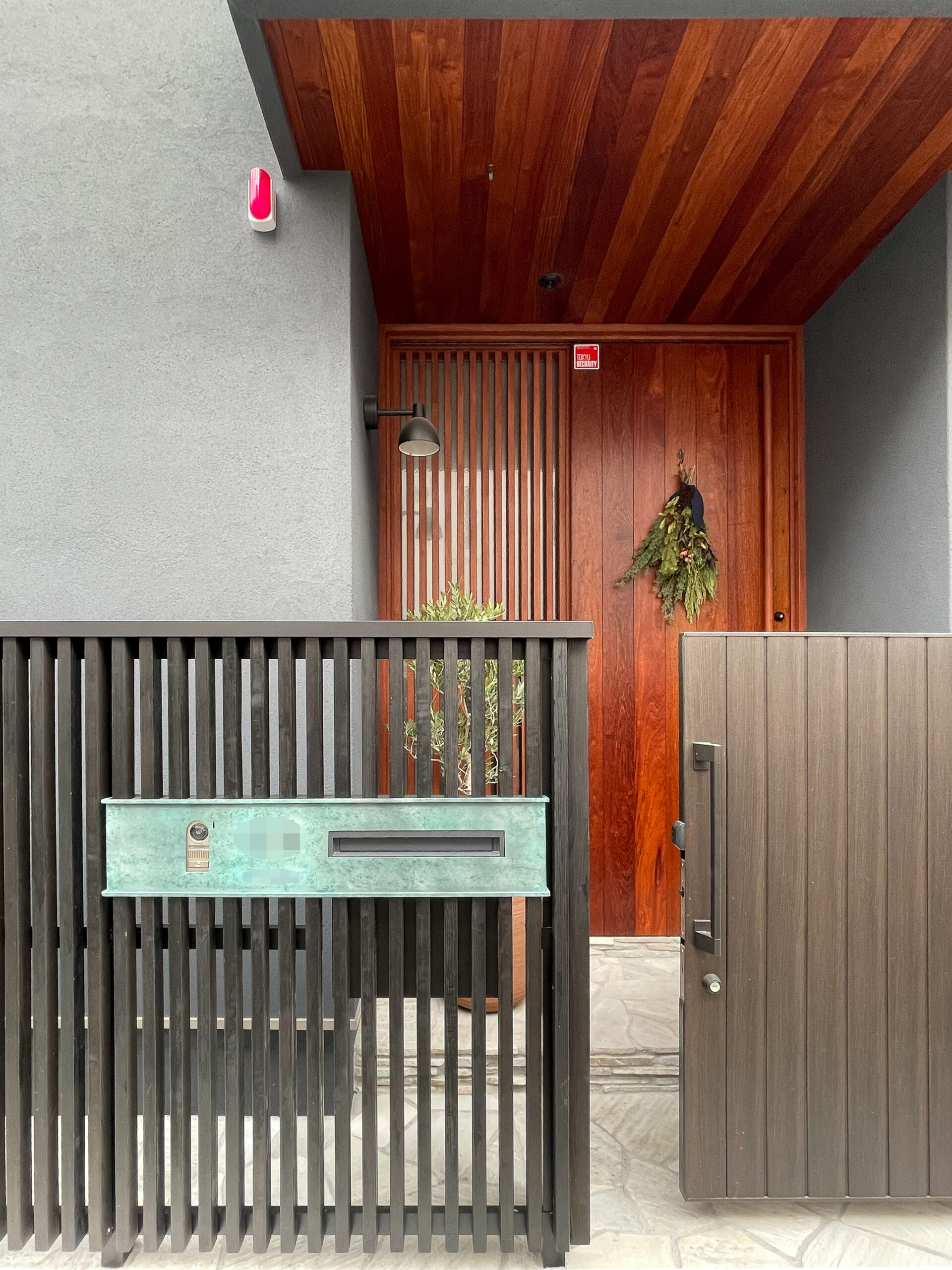 玄関ドア、収納建具、フローリング、ドア枠に花梨(カリン)無垢材を多用した建築。カンザキで長年保管していた高級資材の為、床材以外は弊社でも今後カリン建具家具の施工は出来ない貴重な邸宅。マホガニー1枚板のダイニングテーブルもカンザキオーダー。