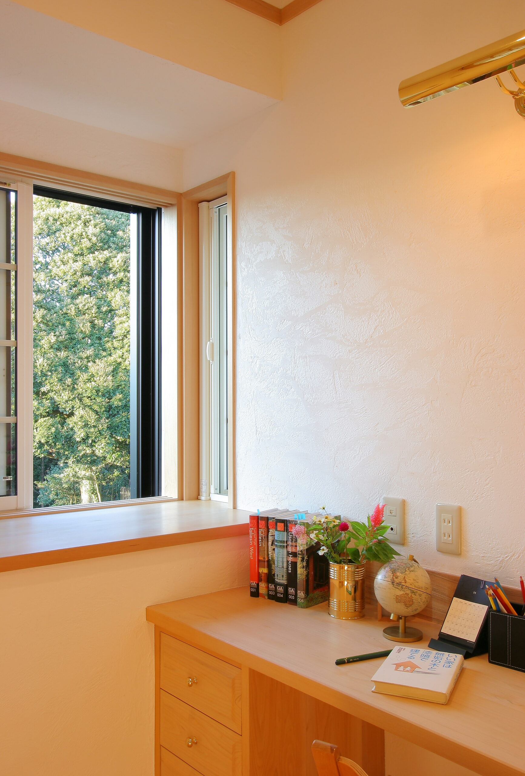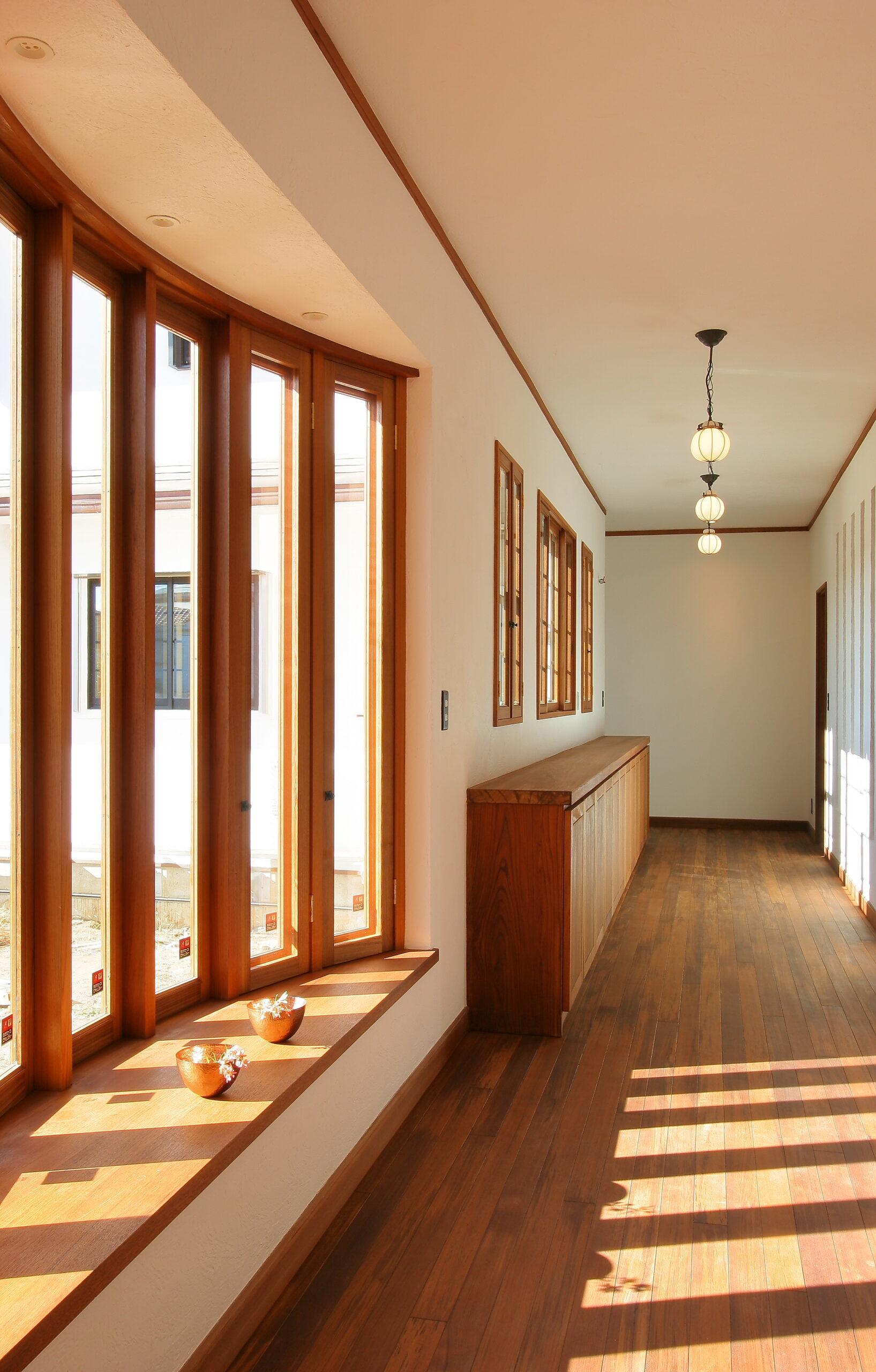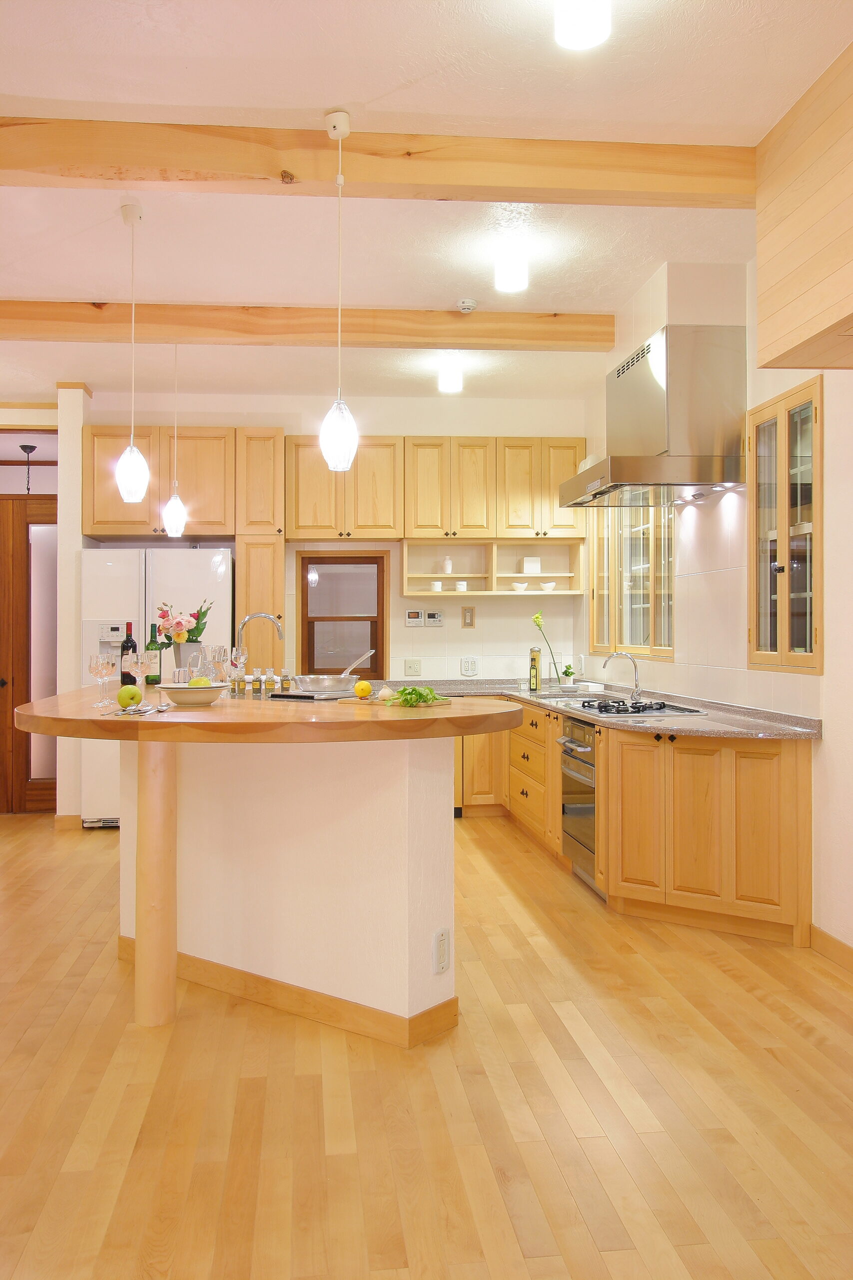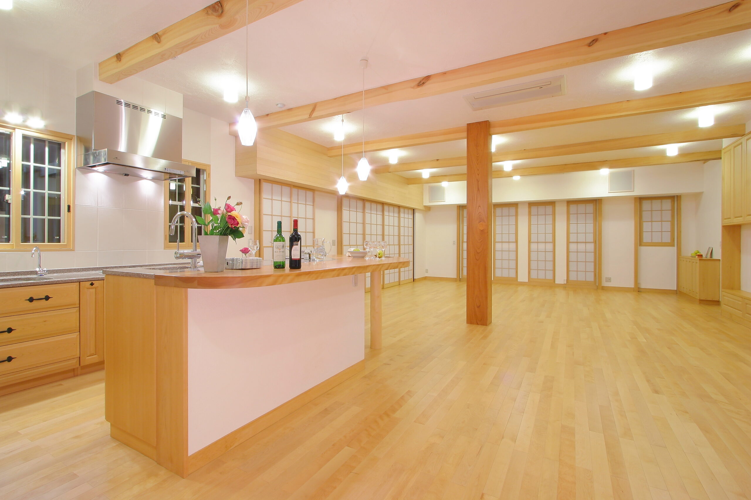 チーク(建具、枠材、床、ボーウィンドウ)・青森ひば(建具、枠材、カンザキオーダーキッチン)樺 (カウンター、床)・7mの内地松の化粧梁。すべて無垢。