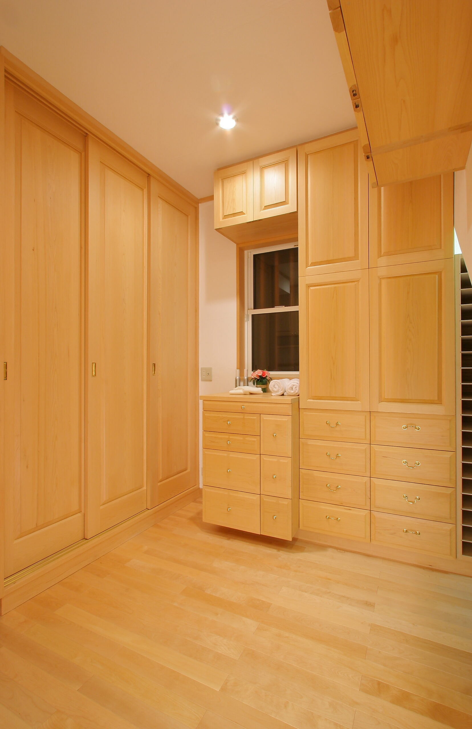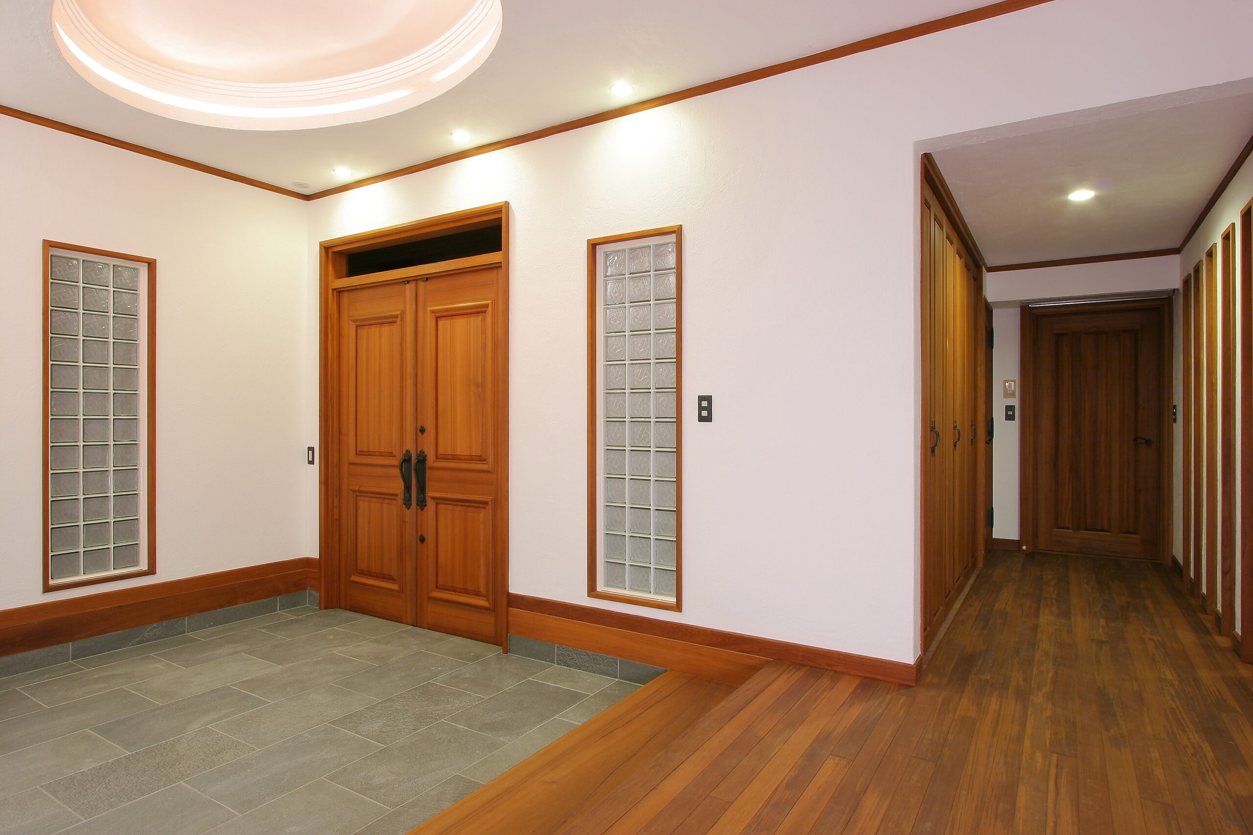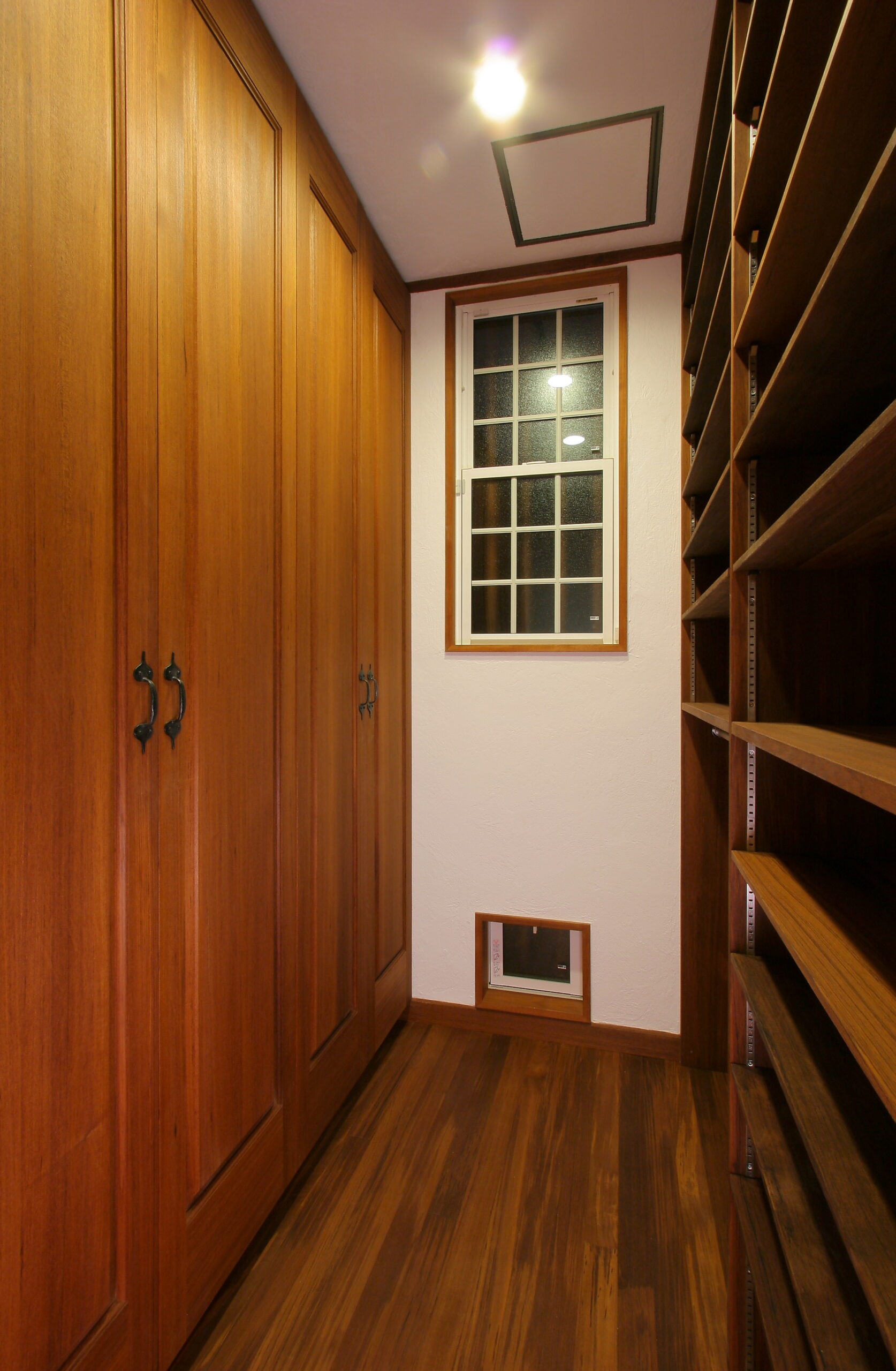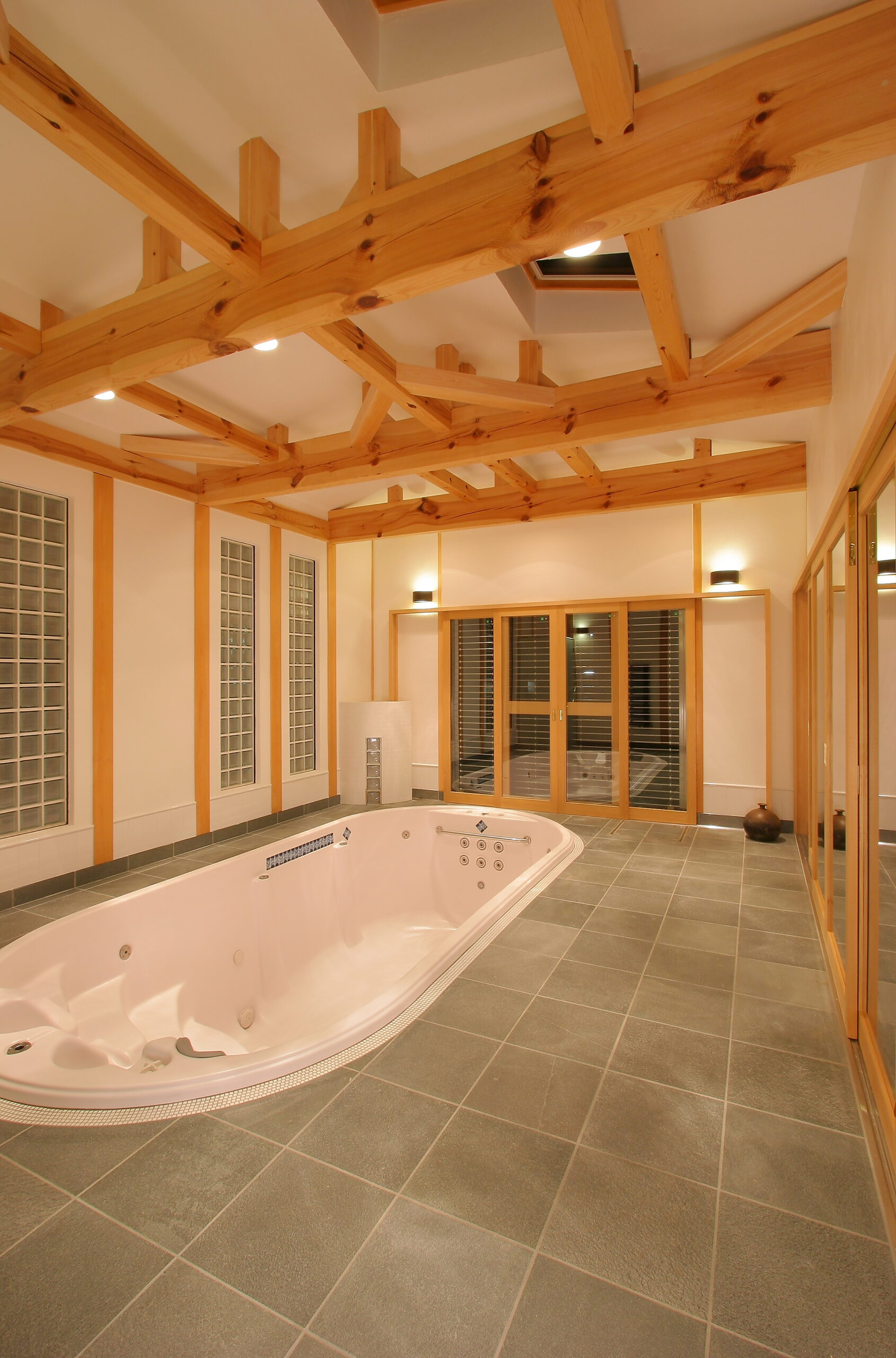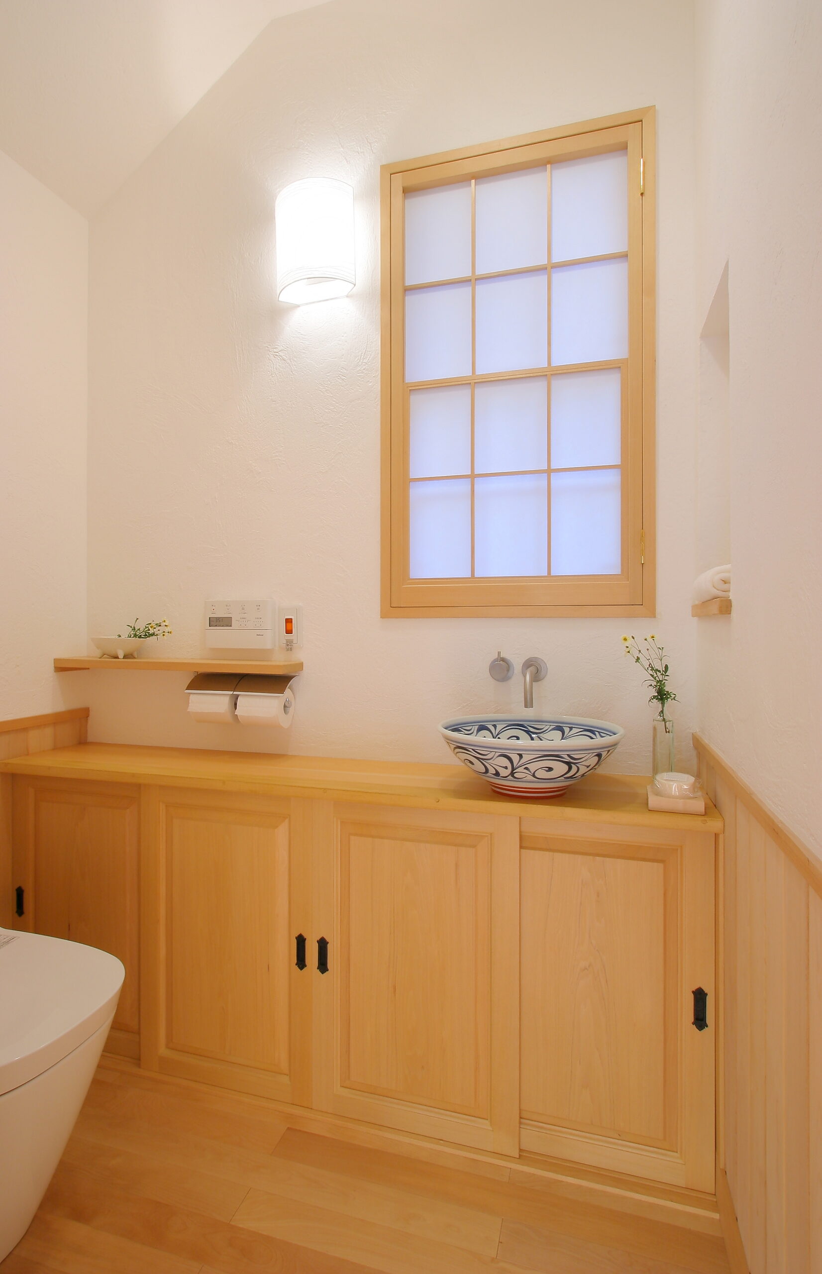チーク(建具、枠材、床、ボーウィンドウ)・青森ひば(建具、枠材、カンザキオーダーキッチン)樺 (カウンター、床)・7mの内地松の化粧梁。すべて無垢。