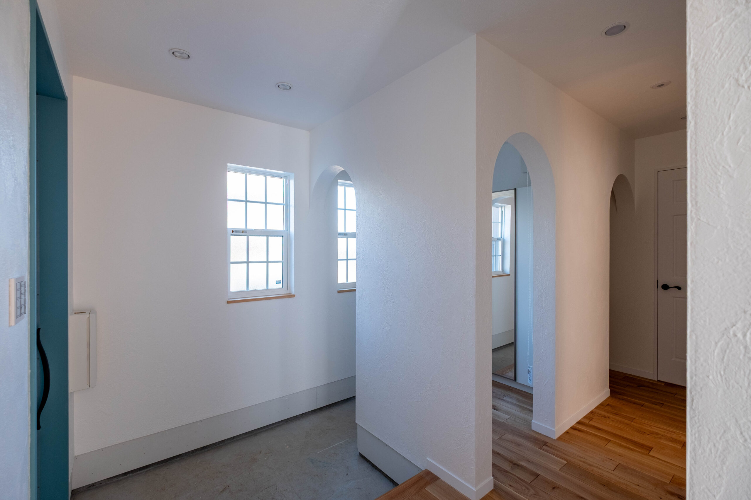 天井壁は漆喰 窓枠、巾木、ドア枠など桧無垢の標準仕様にオスモ白塗装、無垢オーク節有床、押入内は杉無垢などほぼhinox標準仕様。Frenchblueの建具がアクセントの平屋の可愛い家。 -